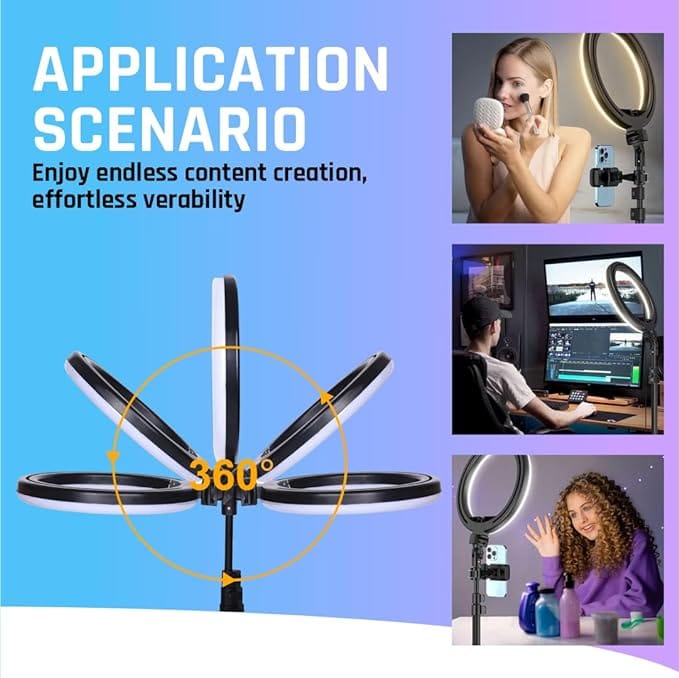eTechtron 10-Inch LED Ring Light with 7-Foot Foldable Tripod | Dimmable 3-Mode Lighting for YouTube, Video Shoots, Live Streaming, Makeup & More Enhance your videos, photography, and makeup sessions with the eTechtron 10-Inch LED Ring Light. Designed for content creators, vloggers, makeup artists, and photographers, this ring light provides bright, even lighting for professional-quality results. Key Features: ✅ Adjustable 3-Mode Lighting – Choose from Warm, Cool, and Natural Light modes with adjustable brightness levels to suit different environments. ✅ 10-Inch LED Ring for Soft & Even Illumination – Perfect for TikTok, YouTube videos, live streaming, makeup, and professional photography. ✅ 7-Foot Foldable & Lightweight Tripod – The sturdy and adjustable tripod stand provides stability and flexibility, making it easy to set up and carry anywhere. ✅ 360° Rotating Phone & Camera Holder – Adjust your device to portrait or landscape mode effortlessly for the perfect angle in every shot. ✅ Universal Compatibility – Works with iPhones, Android phones, DSLR cameras, and webcams for seamless content creation. Specifications: Ring Light Size: 10 inches Lighting Modes: 3 (Warm, Cool, Natural) Brightness Levels: Adjustable Tripod Height: Up to 7 feet (adjustable & foldable) Rotation: 360° for flexible angles Power Source: USB-powered for convenient use Compatibility: Works with smartphones & cameras Package Includes: ✔ 1 x 10-Inch LED Ring Light ✔ 1 x Phone/Camera Holder ✔ 1 x USB Power Cable ✔ 1 x User Manual Upgrade your video shooting, photography, makeup sessions, and live streaming with the eTechtron 10-Inch LED Ring Light – the ultimate lighting solution for flawless visuals!