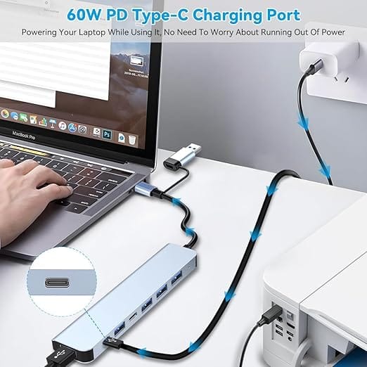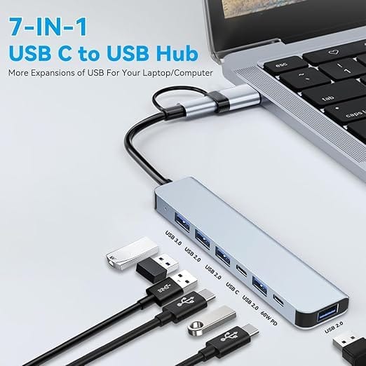 - 【7 in 1 Aluminum USB Hub】: eTechtron 7 in 1 Aluminum USB Hub, USB C hub has 1x USB 3.0 port, 4x USB 2.0 ports, USB C port, and PD 60W charging port. One hub meets your needs of charging, transferring, and downloading videos, music, movies, photos, and other files.