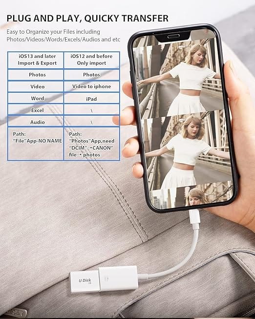 - HOW TO USE: Connect the 8 pin USB Camera Adapter to iPhone/iPad, open the Photos app, which let you choose photos and videos to import, then organizes them into albums. for iOS13+, is the two-way transmite. You can transsfer picture, video, MP3 files, MP4 files, Excel, Word, PPT, PDF on Files App.