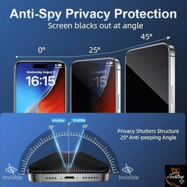 Safeguard your screen and your privacy with the eTechtron Privacy Tempered Glass Screen Protector, designed exclusively for the iPhone 15 Series. With edge-to-edge protection, this screen guard ensures complete coverage from scratches, smudges, and drops—while its advanced privacy filter keeps your content visible only to you, blocking side views.